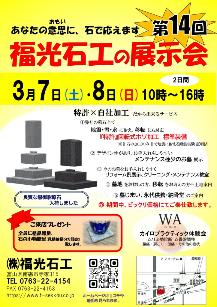 第14回展示会を3月7・8日(土日)の2日間限りで開催いたします。弊社の強みは特許×自社加工による他にできないサービスを持っております。自社工場加工により、製品から仕入れず大きな原石から作りますので、近年の物価上昇でも内容優先度・予算に柔軟に対応し、オーダーメイドにて加工しますので満足度は大いに感じていただけます。又、多発する地震にも対応した特許加工(耐震実験済み)は、すべての墓石に標準装備していますので品質もご安心ください。その他にも毎年ご要望が増えているデザイン性を備えながらもメンテナンスを極端に少なくしたお墓展示や現代版で改修したお墓など展示しておりますので是非拝見ください。