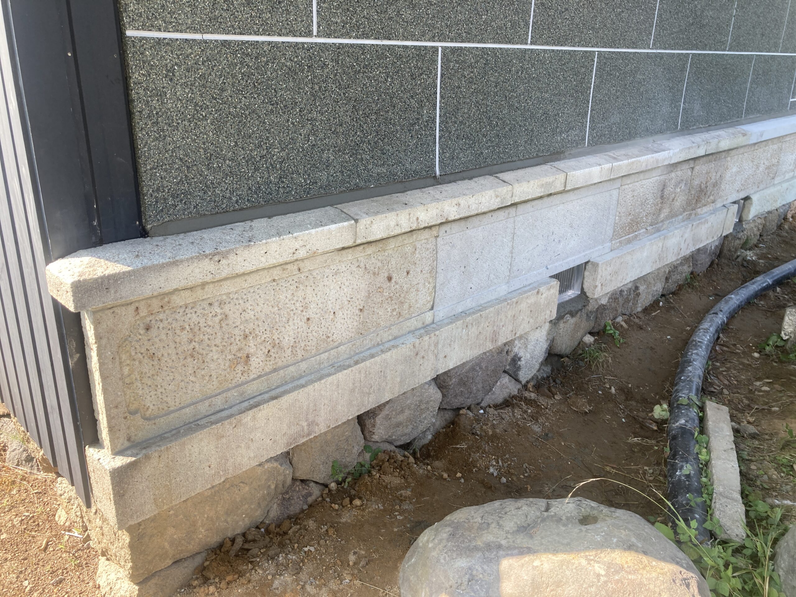 土蔵腰壁石修繕。既存腰壁を再加工利用し、補強修繕。