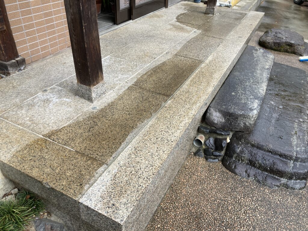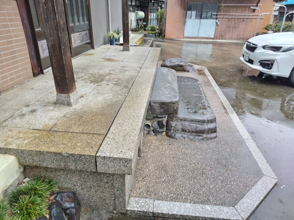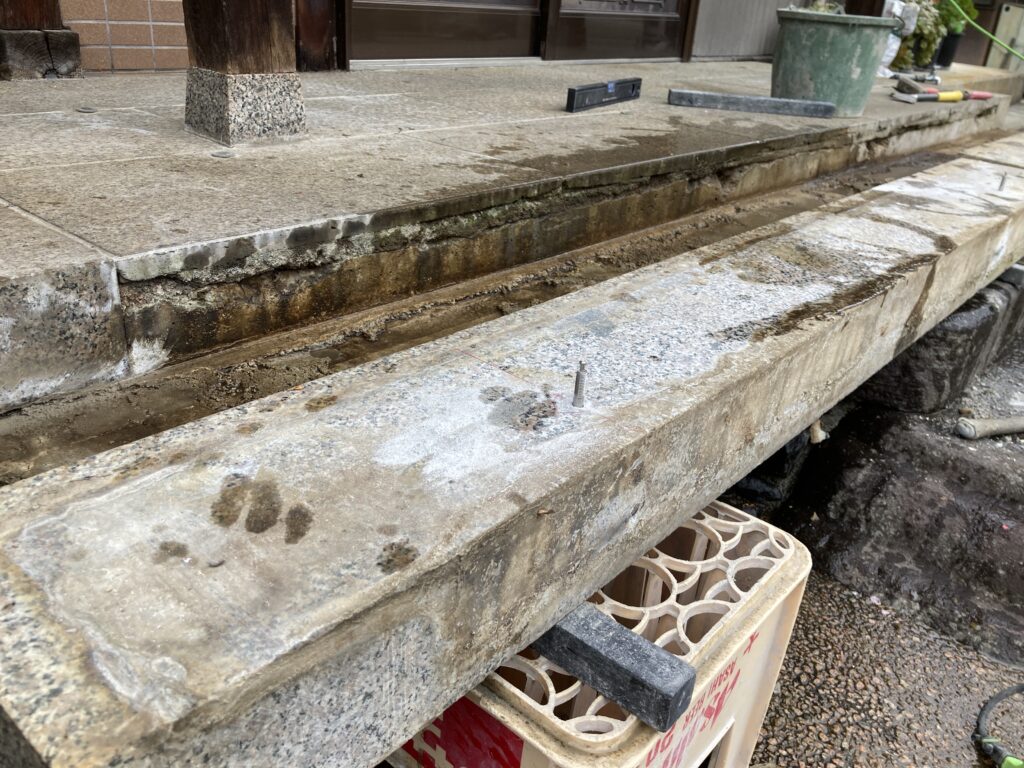 玄関前の葛石(耳石)ズレ直し。ズレ止めに補強金具を入れ据え直し修繕。