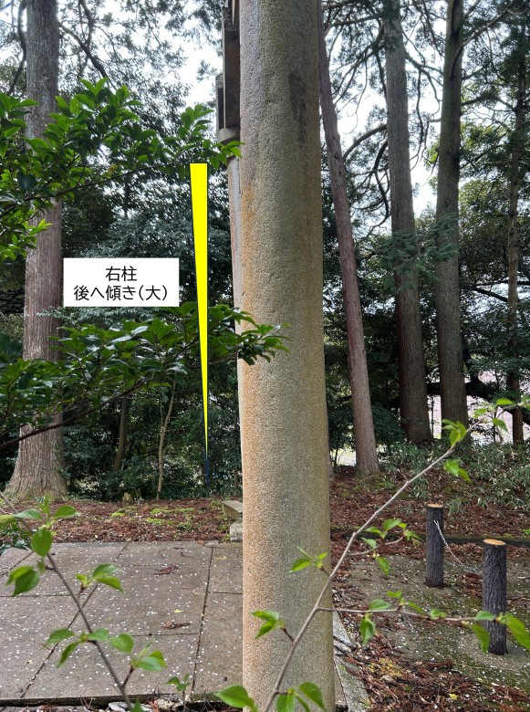 石川県七尾市内にて鳥居の柱が片側のみ傾きねじれを起こしていた。それにより上部の笠石などがおおきくズレ。