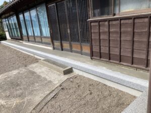玄関前コンクリートが劣化によるひび割れ。お庭に合わせながら、ごちゃごちゃせずスッキリと。 沓脱石(クツヌギ)を据付し上がりやすくしました。 手前に仕上げの向上及び耐久性を上げるため、石張り・洗い出し仕上げ 工事内容 コン […]